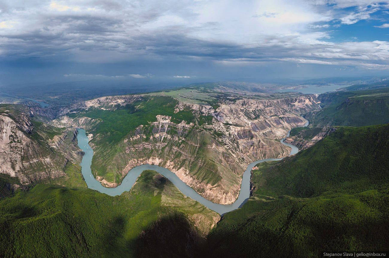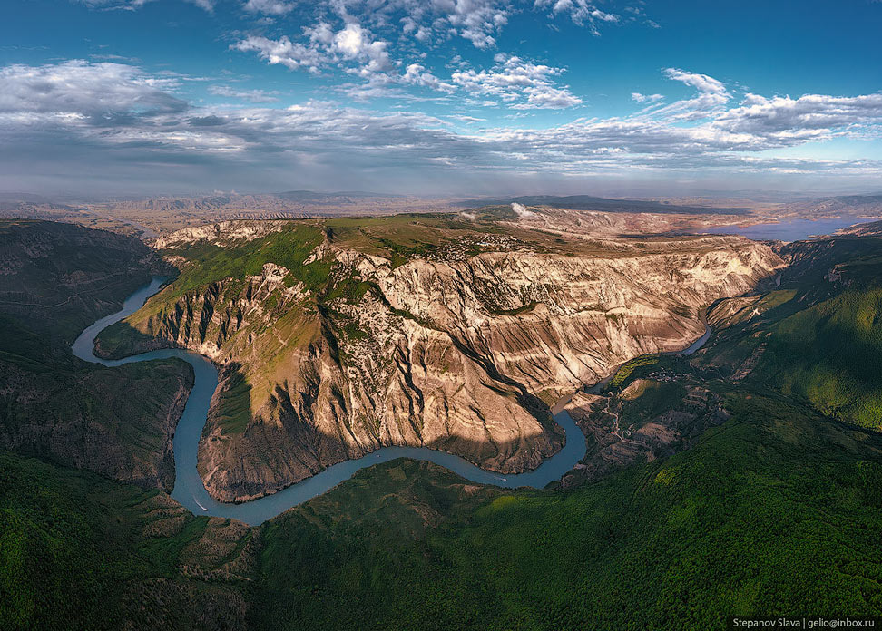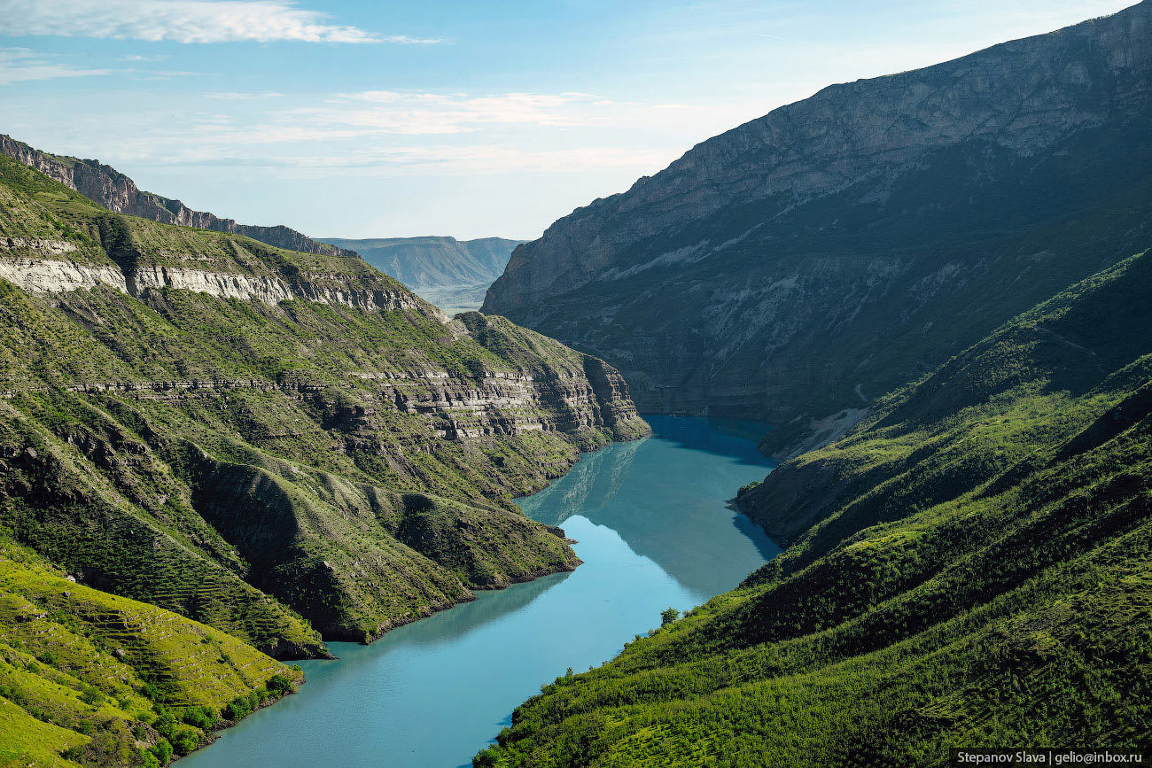 Фотографии и текст Славы Степанова 1. Каньон появился благодаря реке Сулак — самой полноводной в Дагестане. Длина реки почти 170 километров, она начинается в Главном Сулакском каньоне, проходит по всему ущелью длиной 53 км, затем по долине — и впадает в Каспийское море. Река Сулак буквально пробила себе дорогу между Гимринским и Салаватским хребтами — считается, что именно так и появился один из глубочайших каньонов мира. Ущелье начало формироваться ещё в мезозойскую эру, так что у реки было достаточно времени, чтобы вымыть мягкие горные породы и сформировать отвесные скалы каньона. В самом широком месте расстояние между стенами каньона достигает трёх километров, а в самом узком — всего нескольких десятков метров.
