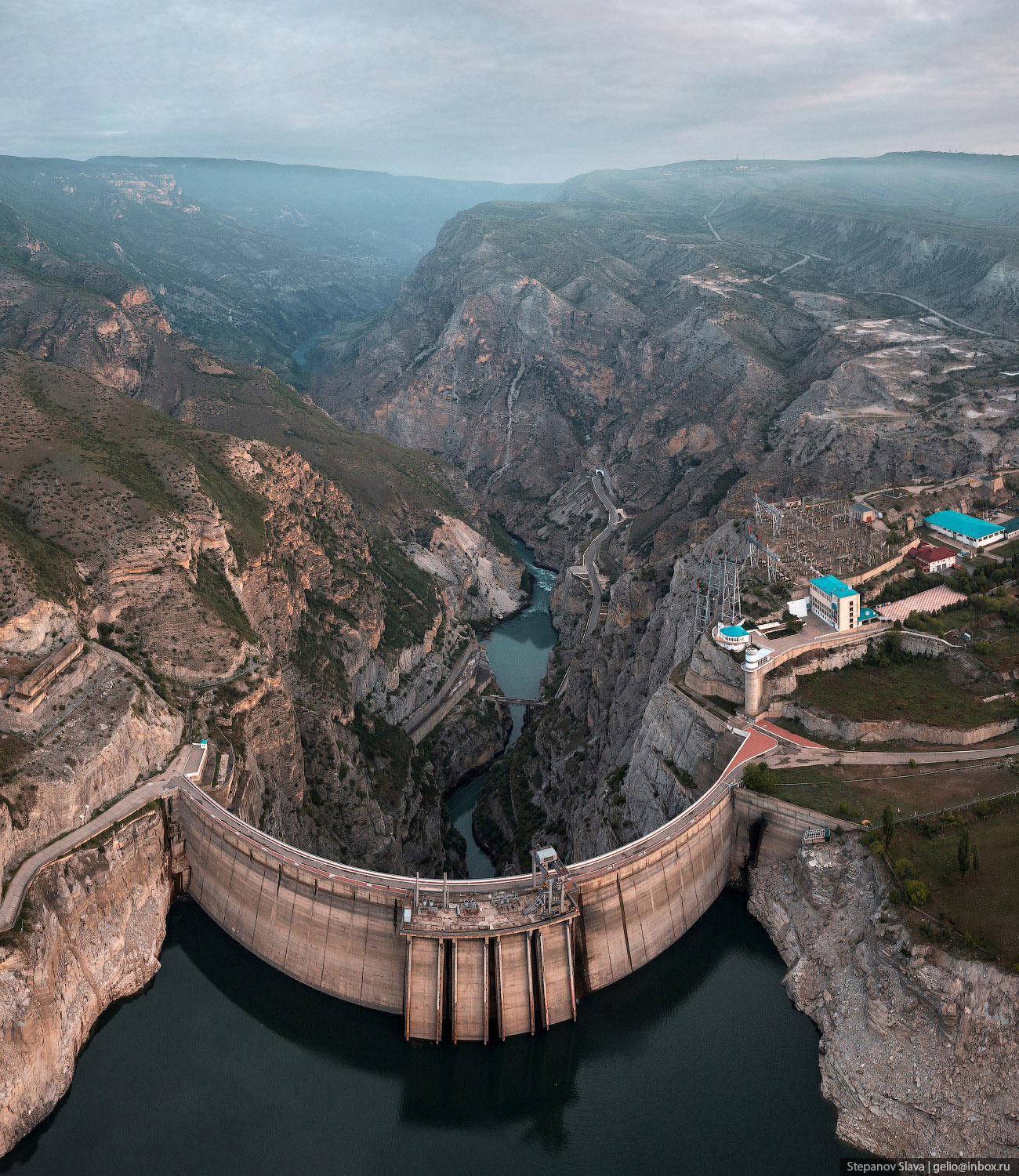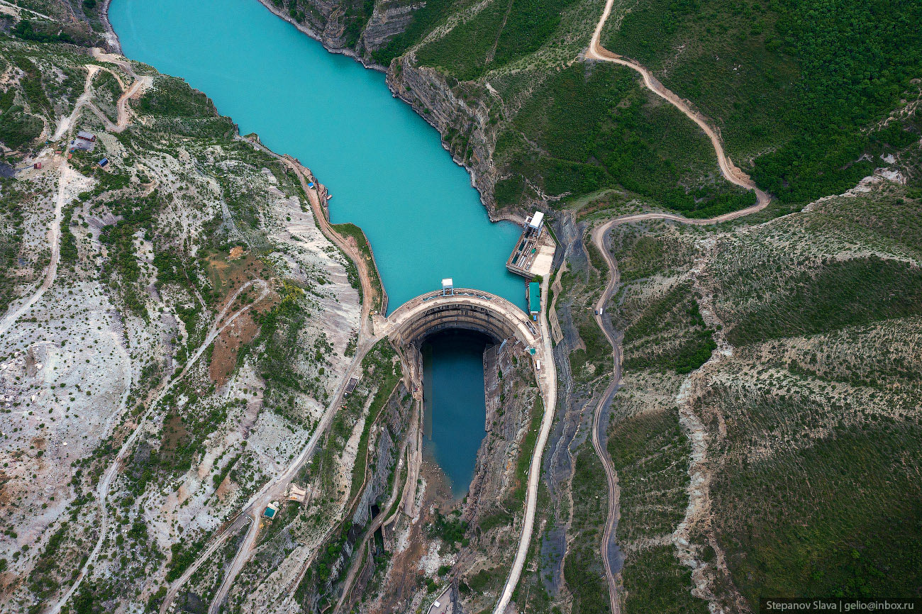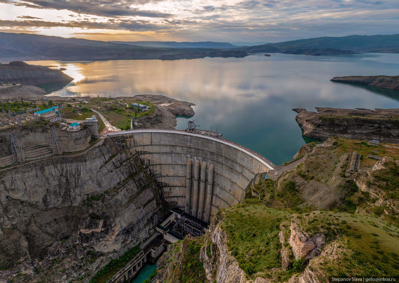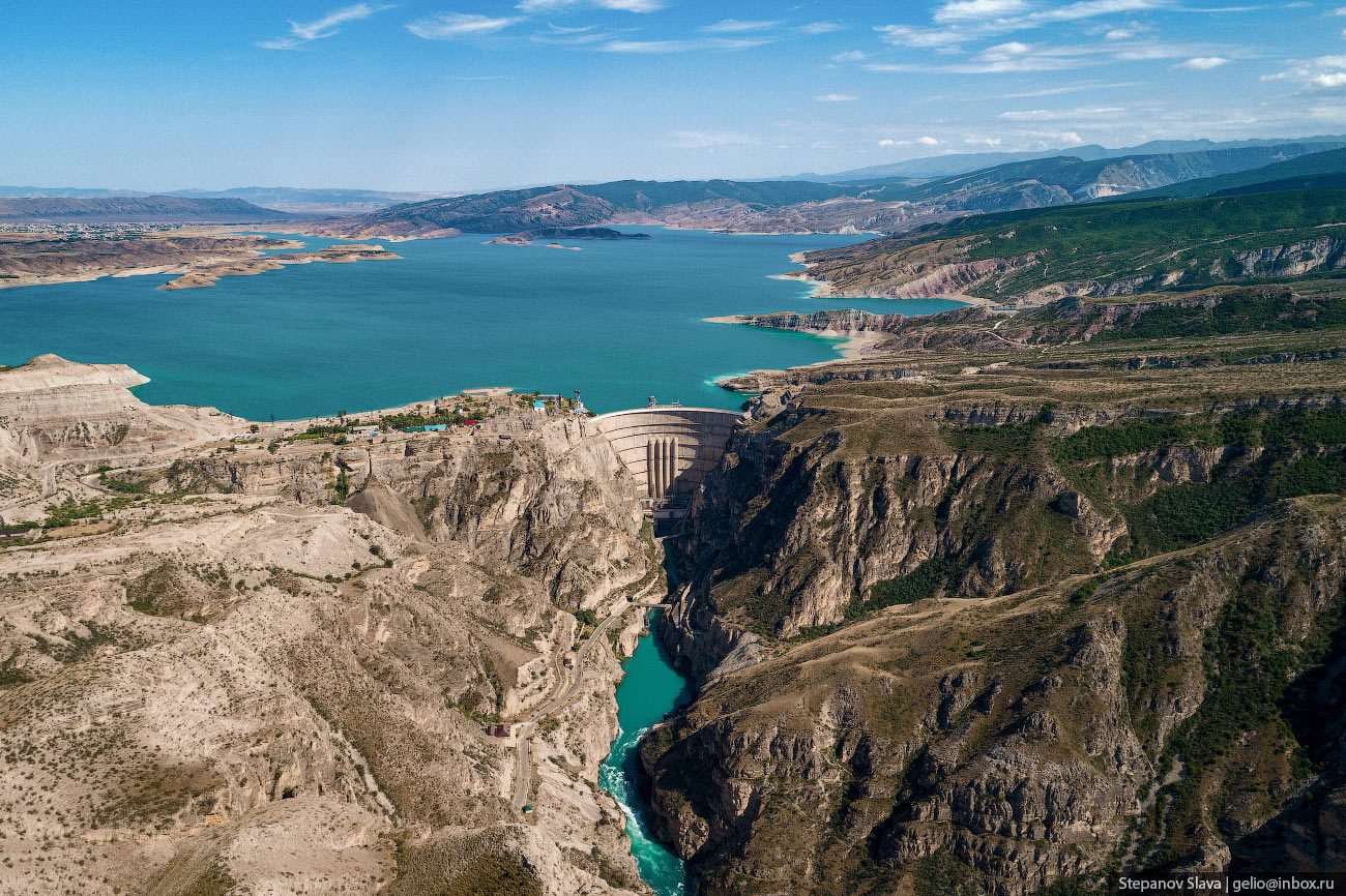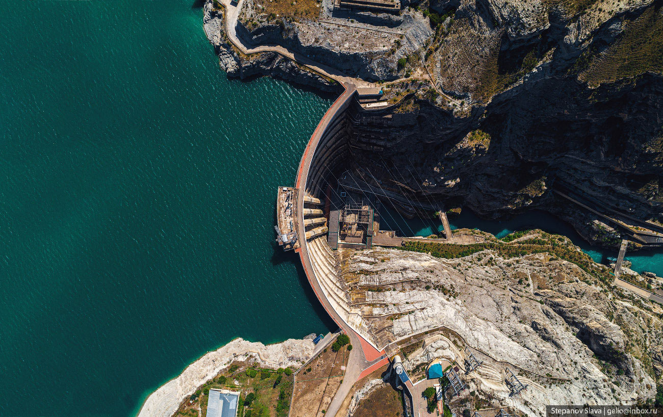 8. После строительства Чиркейской ГЭС среди скал каньона раскинулось большое водохранилище, которое находится на высоте 335 м над уровнем моря. Весь огромный объём воды удерживает стройная арочная плотина — она сужается от 338 метров наверху до 12 метров внизу. А высота этого изогнутого клина — 232 метра. Плотина Чиркейской ГЭС — самая высокая арочная плотина в России.