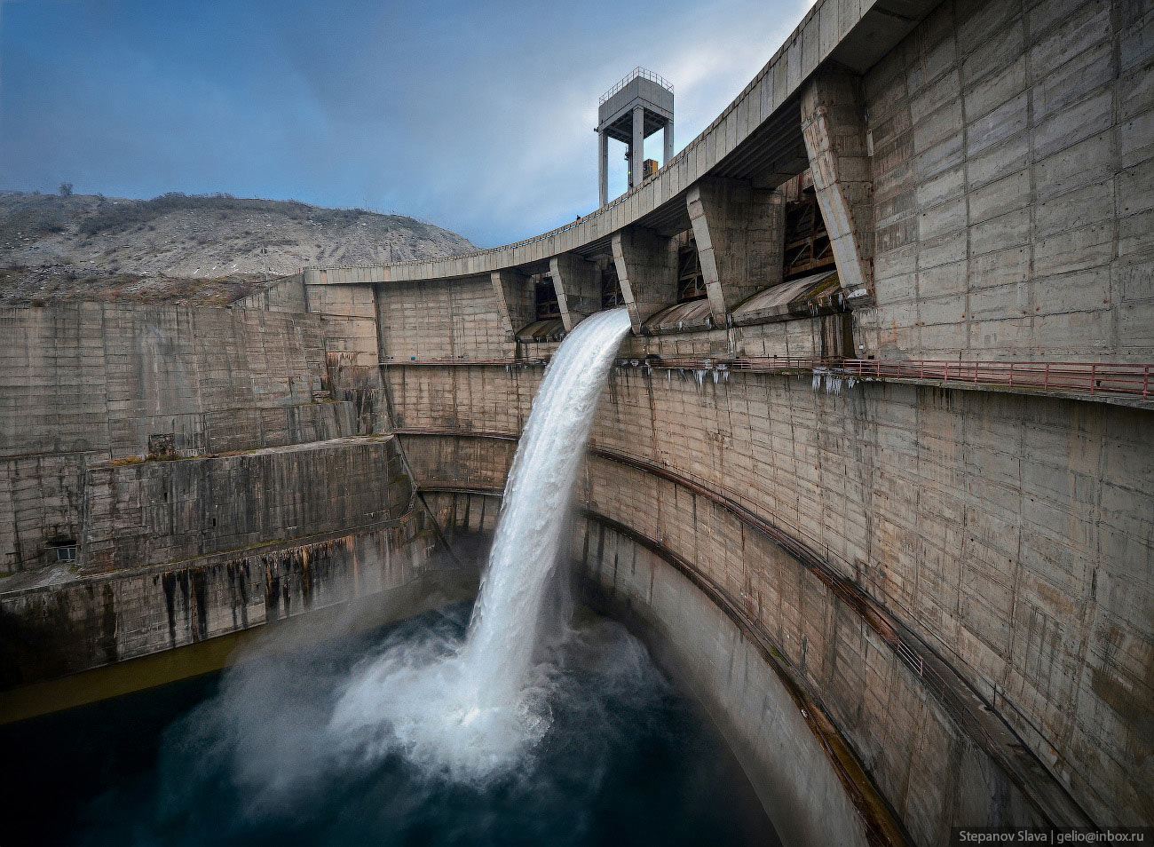 9. Ширина дороги на плотине всего 6 метров, а внизу основание расширяется до 30 метров. Конструкция поделена на 18 вертикальных секций, крайние уходят глубоко в скалы ущелья. В правый берег плотина врезается на 10-15 метров, в левый — до 50 метров.