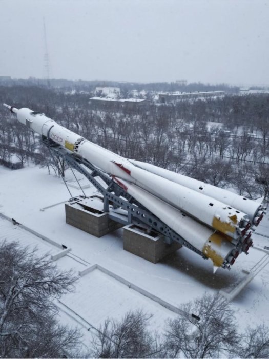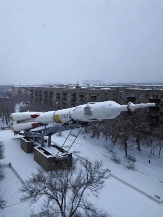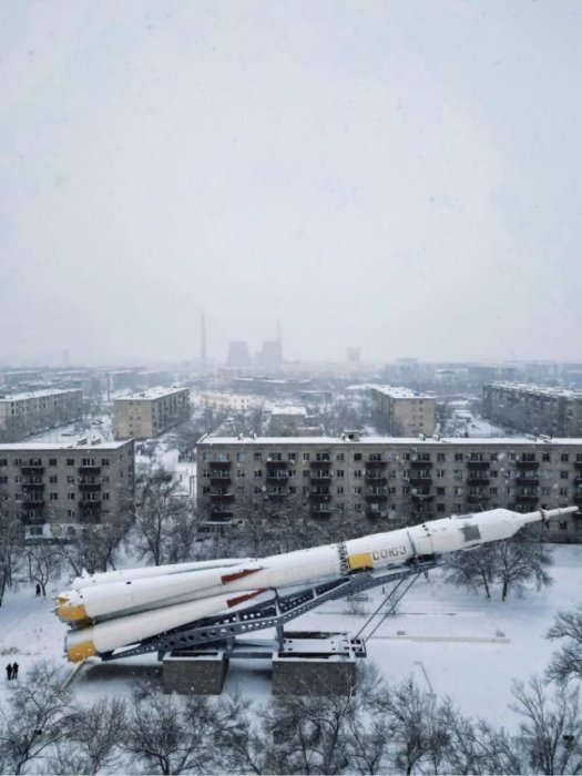 Но нет, всё реально. На фото — памятник ракете-носителю «Союз-У» в Байконуре. Монумент установлен прямо в городской застройке, и контраст между космическим гигантом и обычными многоэтажками выглядит почти сюрреалистично.