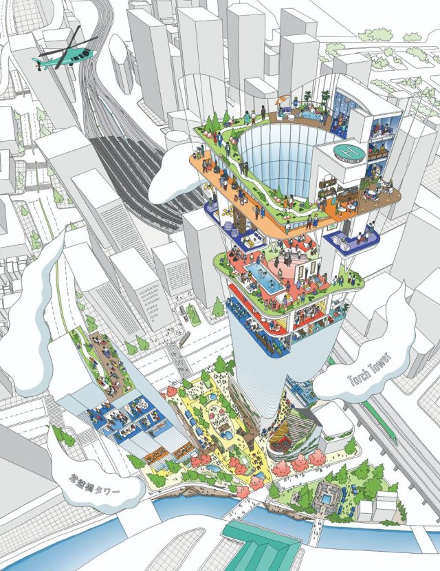 Башня Tokyo Torch высотой 390 метров появится в 2027 году напротив Tokyo Station. Девелопер проекта, компания Mitsubishi Estate, планирует создать вокруг новый городской район. В самом небоскрёбе разместятся отель и смотровая площадка на верхних этажах.