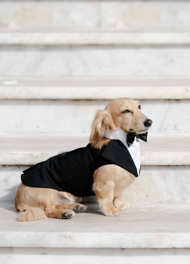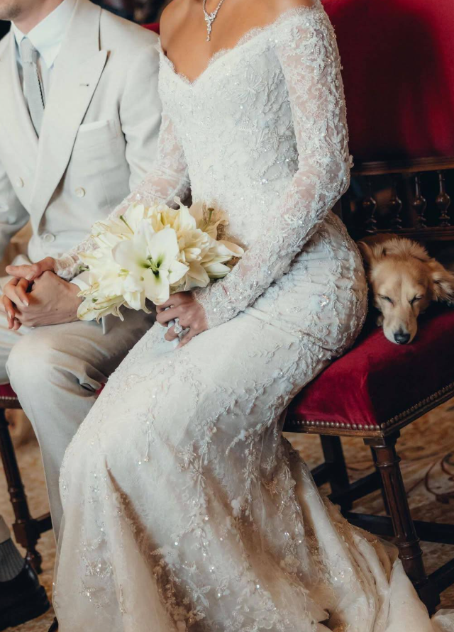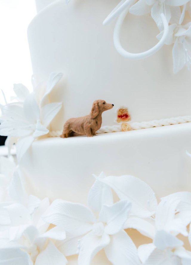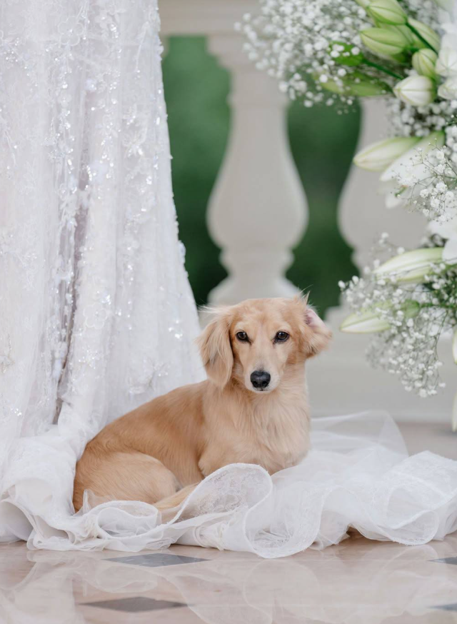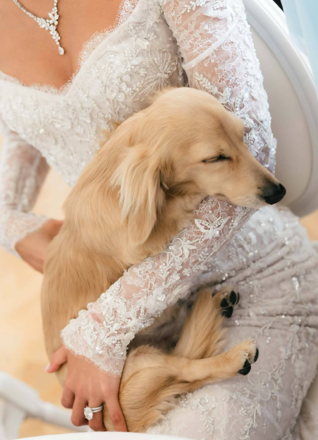 Пока все обсуждали платье и кольца, настоящей звездой сторис стала длинношерстная такса по кличке Лео. Пёс уверенно перетянул на себя часть внимания гостей.