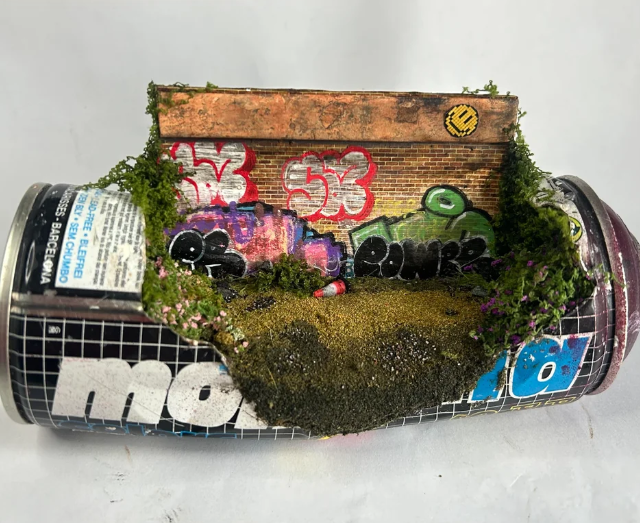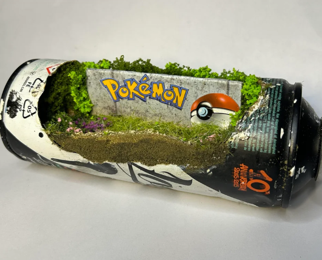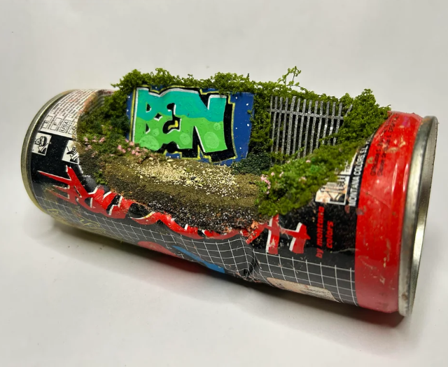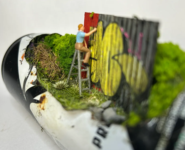 Он аккуратно вскрывает банки и создаёт внутри миниатюрные арт-сцены: маленькие фигурки, ландшафты и целые микромиры, спрятанные внутри металлической оболочки.