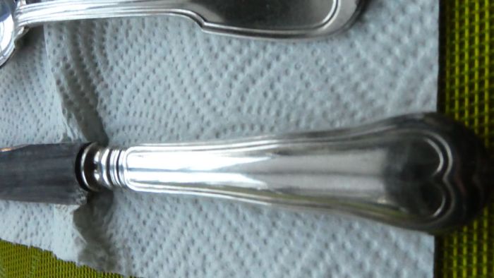 Как видно, на ложках ни следа потемнения. Ножи тоже стали выглядеть лучше, однако, к сожалению, часть серебряного слоя исчезла с их поверхности, всё-таки время берёт своё. Придётся отнести их специалисту для повторного посеребрения.