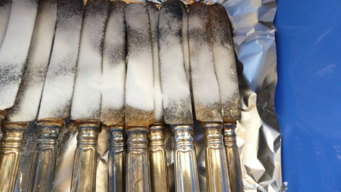 Данный процесс может занять до получаса времени. По окончании необходимо промыть столовые приборы водой и вытереть насухо полотенцем.