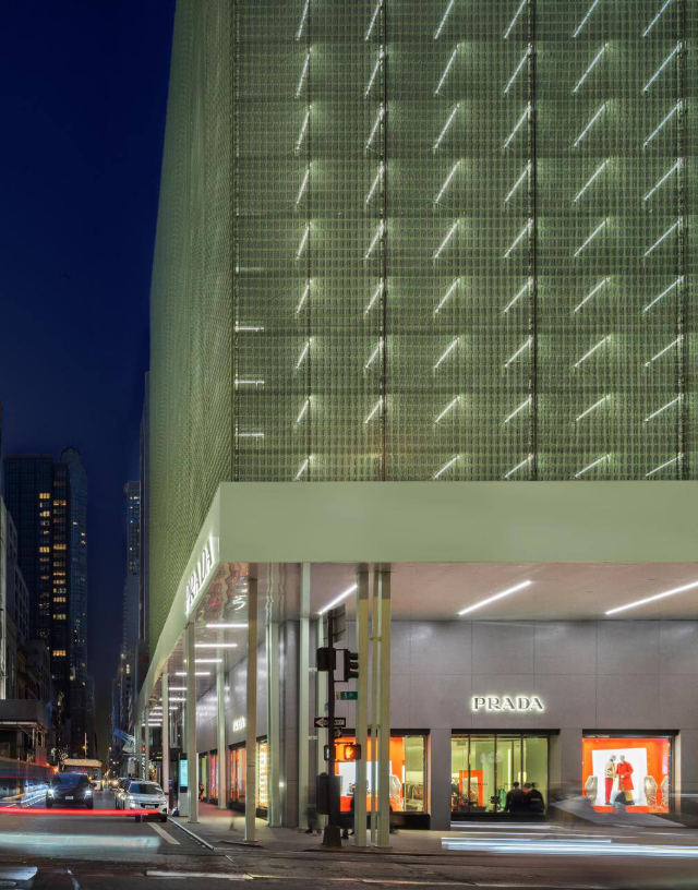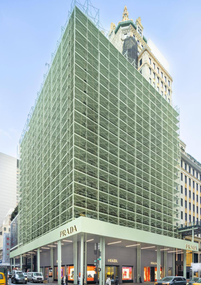 Итальянский модный дом Prada необычно оформил фасад своего флагманского бутика на Пятой авеню в Нью-Йорке. Вместо стандартной защитной сетки строительные леса украсили продуманным графическим узором, превратив ремонт в часть городской эстетики.