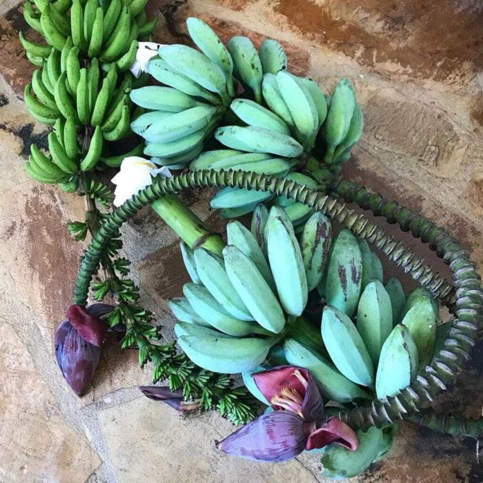 Форма его плодов типична для обычных бананов, отличается только цвет и вкус. Местные жители даже прозвали их «лесным мороженым» — если перемолоть их в блендере и добавить крошеный лед, они и в самом деле начнут напоминать десерт.