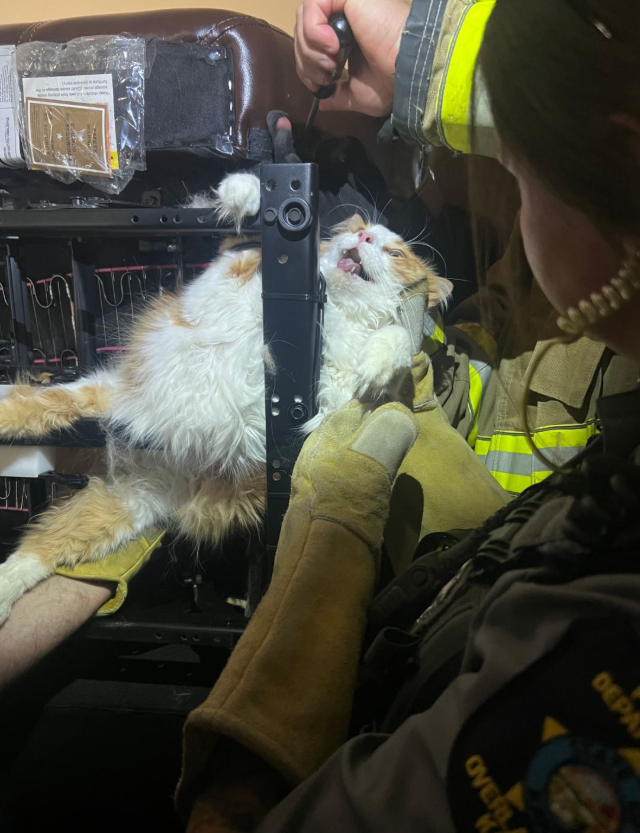 Из-за лишнего веса животное застряло внутри мебели, и хозяину пришлось вызывать пожарных. Спасатели аккуратно освободили питомца без травм.