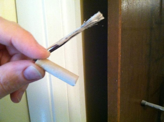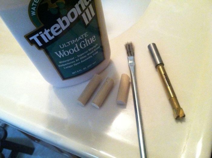 При совпадении размеров, детской кисточкой для акварели обрабатываем поверхность внутри отверстий клеем для дерева и обрабатываем непосредственно все дюбеля. Главное – не забыть промыть кисточку теплой водой до того, как высохнет клей.