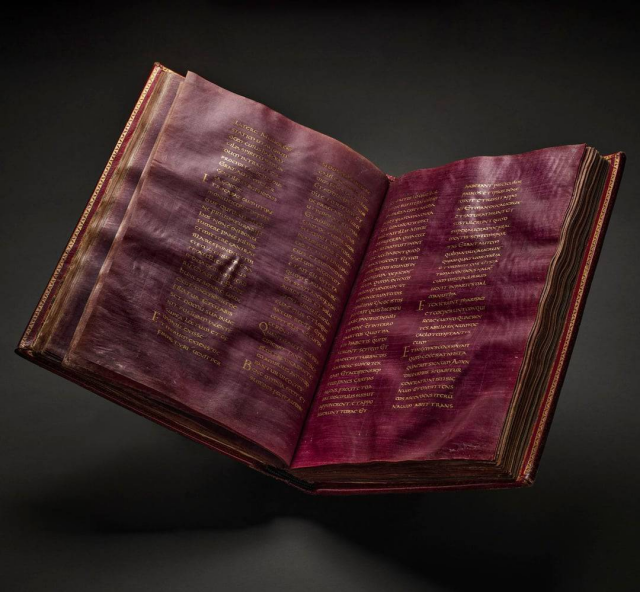 Текст Евангелия написан золотыми чернилами на пергаменте, окрашенном в пурпурный цвет.
