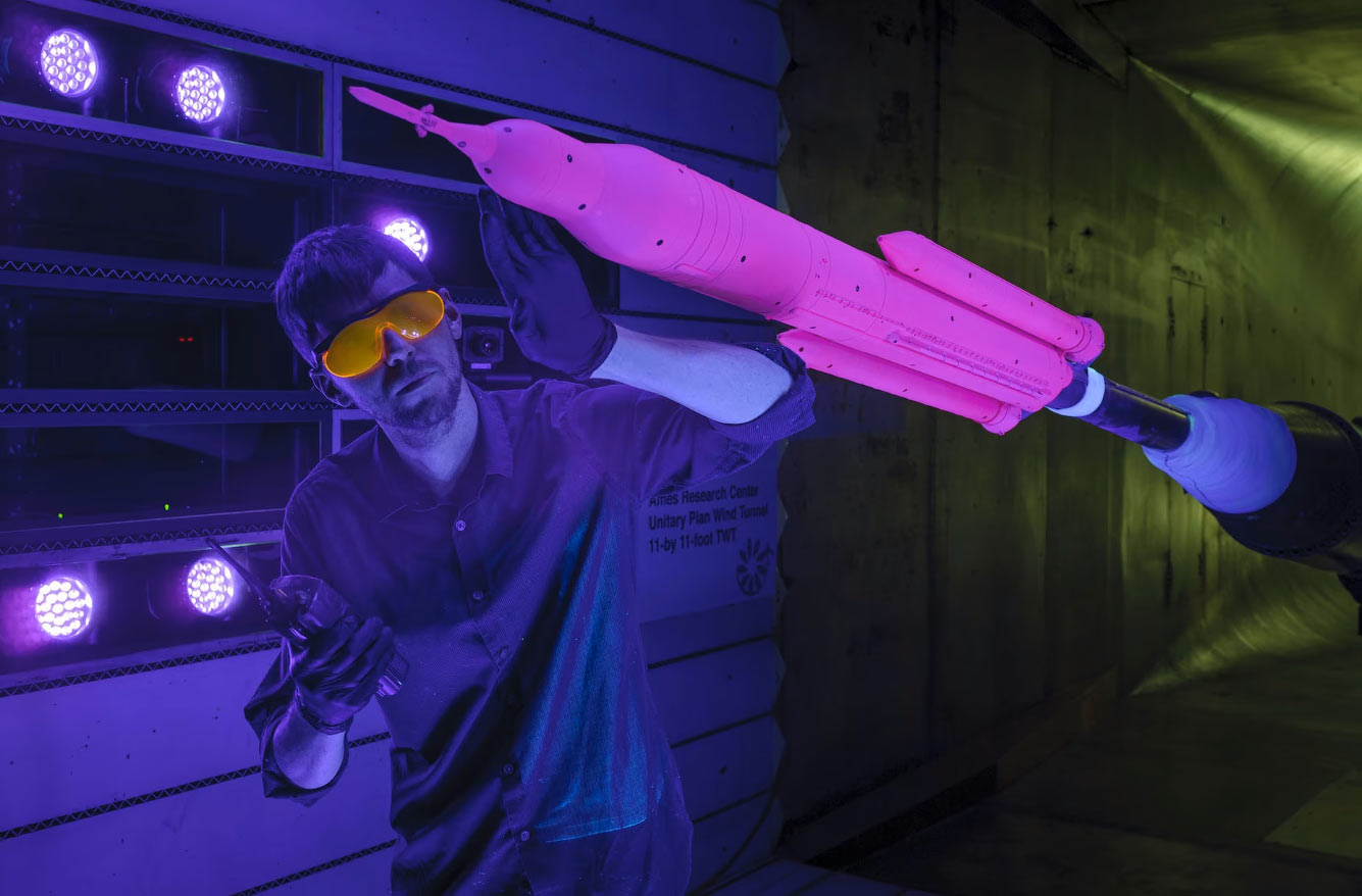 В 2016 году Патрик Ши осматривает модель ракеты SLS в масштабе 1,3% в аэродинамической трубе исследовательского центра НАСА имени Эймса в Силиконовой долине, штат Калифорния. Испытания были проведены для определения поведения мощной ракеты при наборе высоты и ускорении для преодоления звукового барьера после запуска. Для проверки нового метода оптических измерений инженеры центра Эймса покрыли модель SLS нестабильным чувствительным к давлению лакокрасочным покрытием, которое под воздействием освещения светится тусклее или ярче в зависимости от давления воздуха, действующего на различные участки ракеты. (Фото Dominic Hart / Ames / NASA):