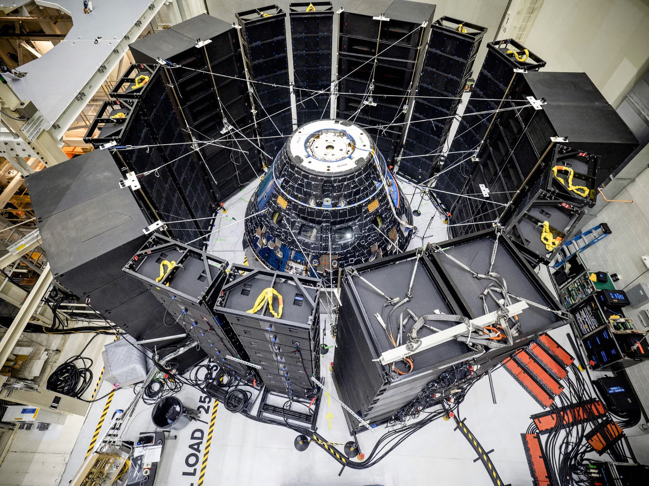 Пилотируемый модуль «Орион» проходит акустические испытания в прямом поле, в ходе которых использовались установки, состоящие более чем из 1500 динамиков, чтобы подвергнуть космический аппарат воздействию максимальных уровней акустики, которые он испытает при запуске. Данные о реакции космического аппарата и звуковом давлении собирались с помощью микрофонов, тензометрических датчиков и акселерометров. (Фото Radislav Sinyak / Johnson Space Center / NASA):