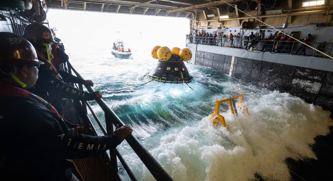 На палубе эсминца USS Somerset разбивается волна, пока команды работают над подъемом испытательного образца пилотируемого модуля — полномасштабной копии космического корабля Orion — во время отработки операций по подъему объектов в рамках программы Artemis у побережья Калифорнии 27 марта 2025 года. (Фото Joel Kowsky / NASA):