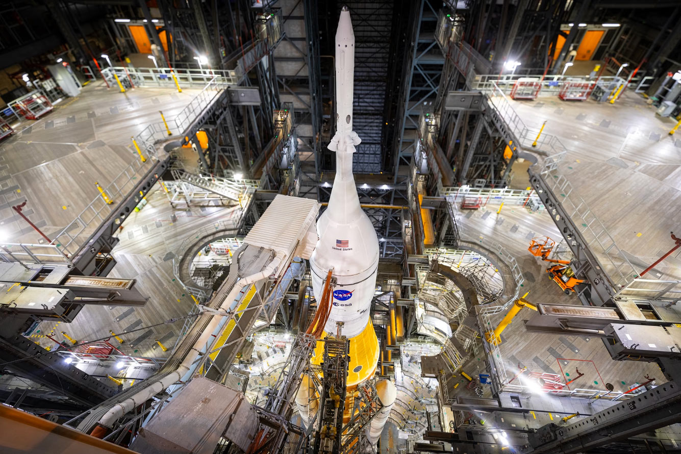 23 марта 2025 года команды из подразделения NASA Exploration Ground Systems и главного подрядчика Amentum интегрируют ракету SLS с твердотопливными ускорителями на мобильную пусковую установку № 1 внутри ангара № 3 здания сборки космических аппаратов в Космическом центре имени Кеннеди. (Фото Frank Michaux / NASA):