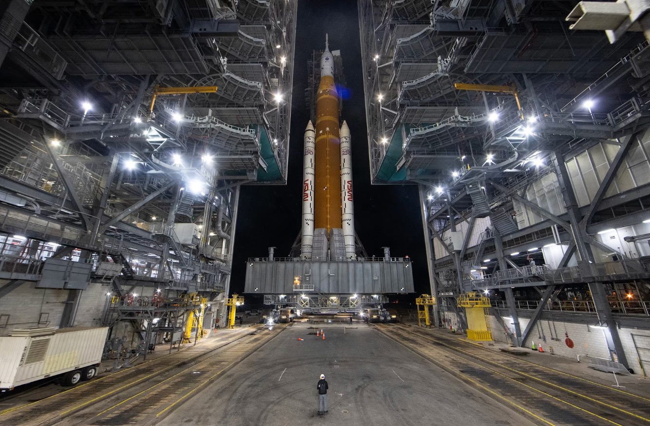 Ракета Artemis II SLS и космический корабль Orion будут вывезены на стартовый комплекс 39B 20 марта 2026 года. (Фото John Kraus / NASA):