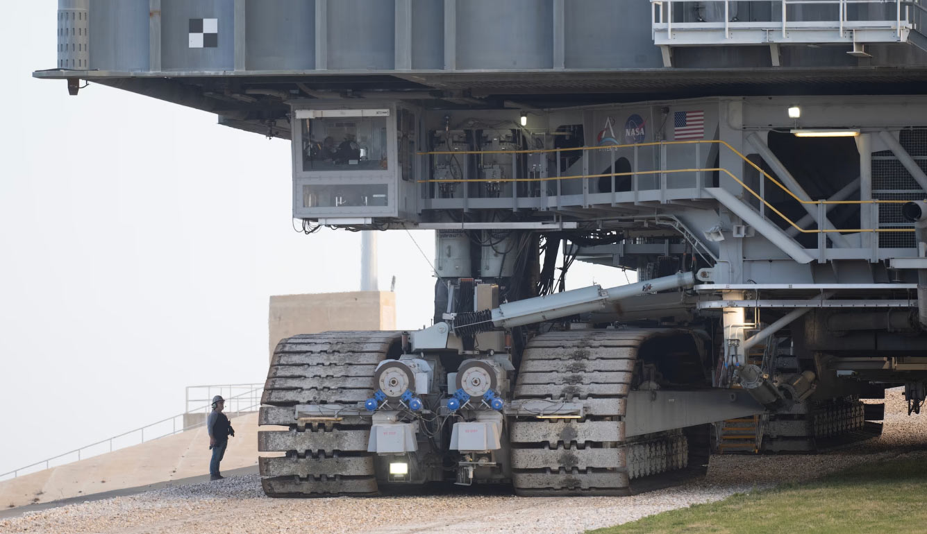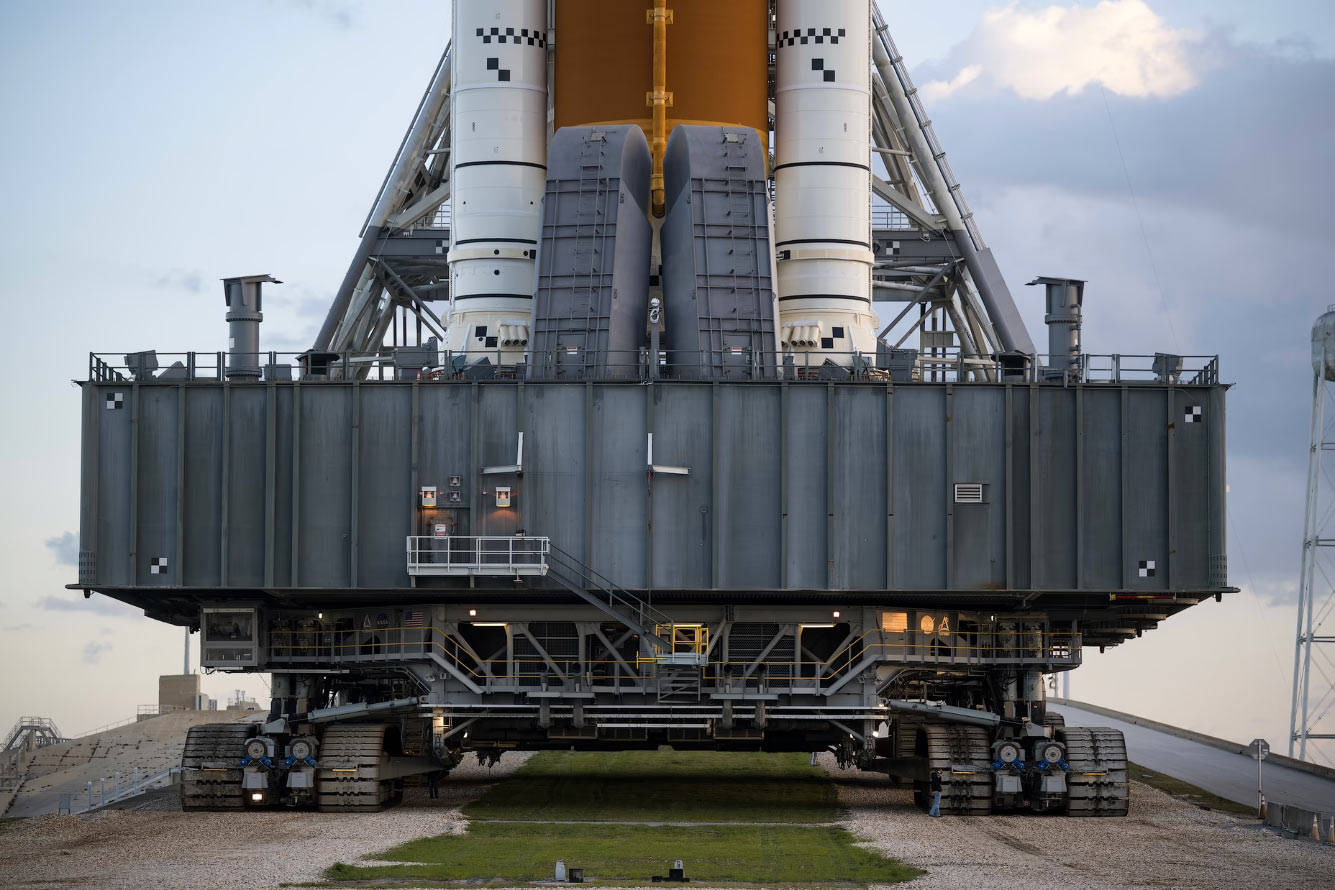 Мобильная платформа НАСА 20 марта 2026 года доставляет ракету SLS и космический корабль Orion по небольшому наклонному склону на стартовую площадку 39B в Космическом центре имени Кеннеди. (Фото Joel Kowsky / NASA):