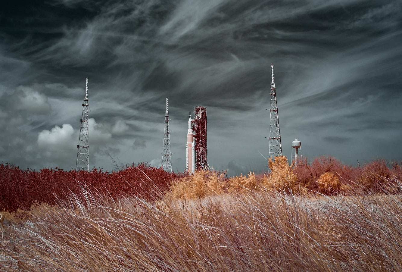 На этом инфракрасном снимке, сделанном во вторник, 31 марта 2026 года, на стартовом комплексе 39B Космического центра имени Кеннеди НАСА во Флориде, запечатлены ракета-носитель НАСА Artemis II и космический корабль Orion. (Фото NASA/Bill Ingalls):