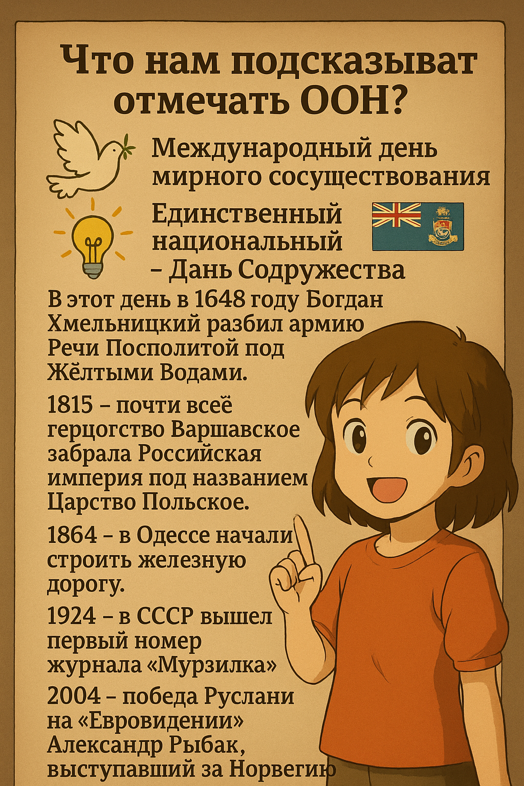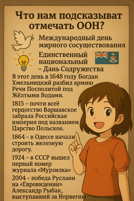 Сегодня отмечаем важные события по версии ООН: Международный день мирного сосуществования и Международный день света. А вот на Каймановых островах - свой национальный праздник, День Содружества.