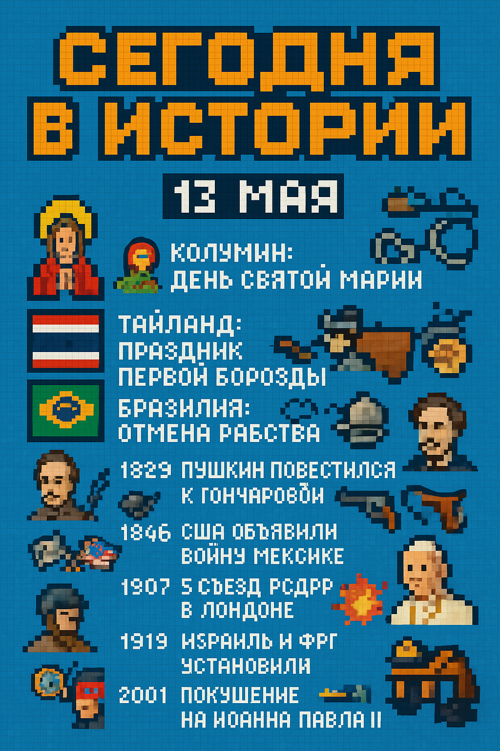 В этот день в истории: 1829 год: Пушкин сделал предложение Наталье Гончаровой. 1846 год: США объявили войну Мексике. 1907 год: в Лондоне прошел V съезд РСДРП. 1919 год: армия Юденича начала поход на Петроград. 1965 год: Израиль и ФРГ установили дипломатические отношения. 1981 год: неудачное покушение на папу Иоанна Павла II. 2005 год: вооруженный мятеж в Узбекистане, сотни жертв. 2014 год: трагедия на шахте в Турции, в результате взрыва погибли 282 человека.
