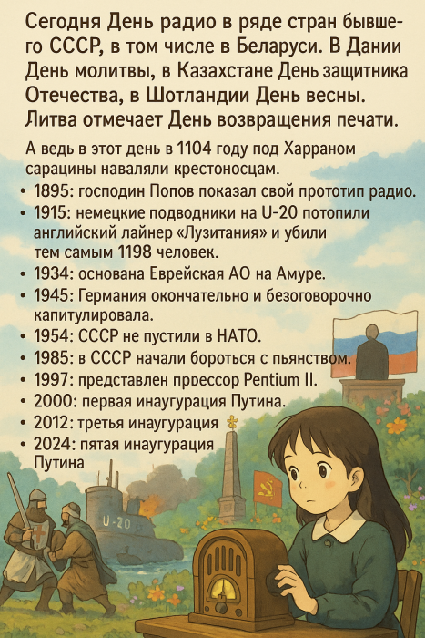 Сегодня День радио в ряде стран бывшего СССР, в Дании — День молитвы, в Казахстане — День защитника Отечества, в Шотландии — День весны, а Литва празднует День возвращения печати.