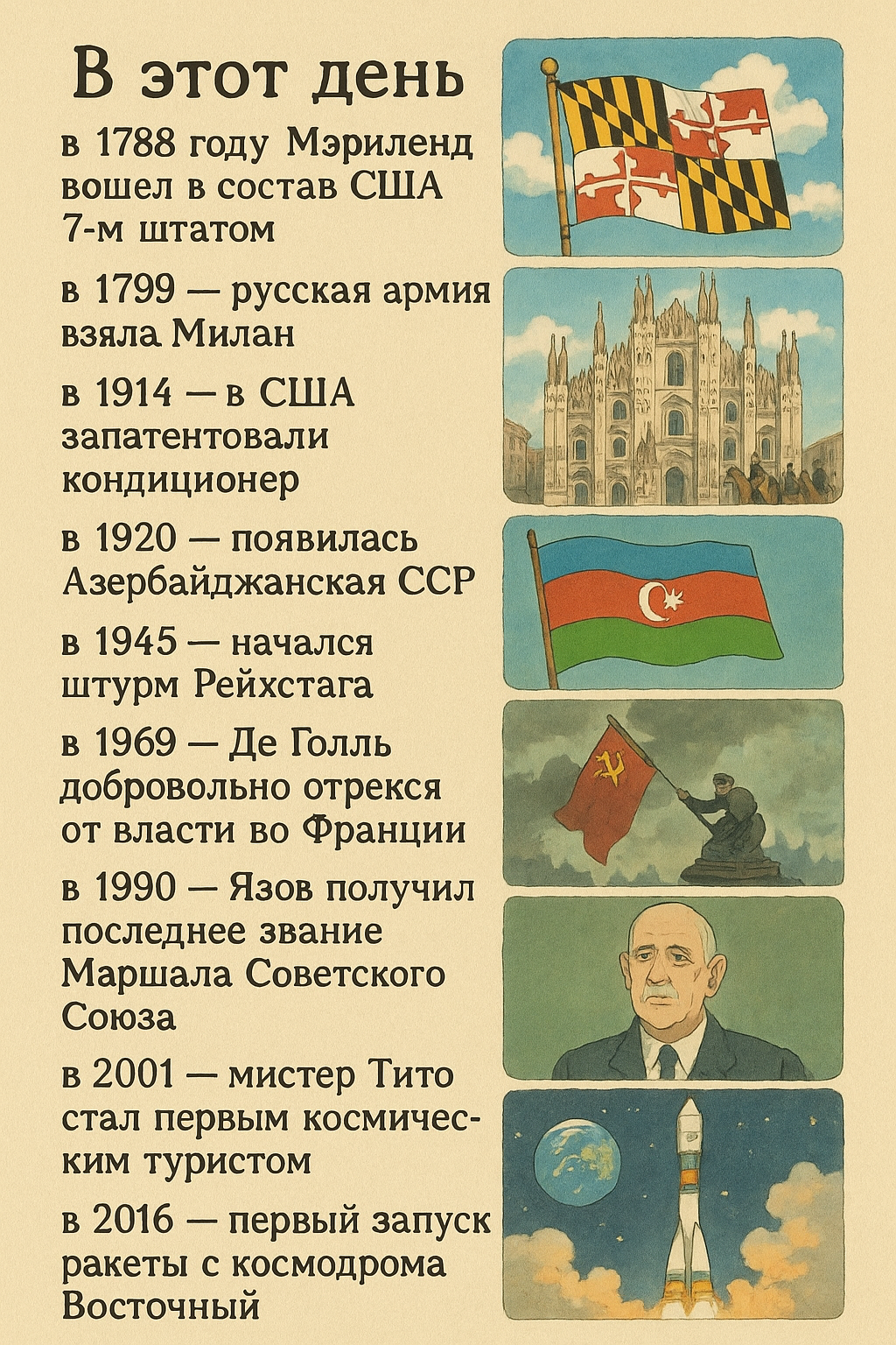 Сегодня Всемирный день охраны труда (и внезапный выходной), в Афганистане — странный День победы в джихаде; в истории: Мэриленд — 7-й штат США (1788), русские взяли Милан (1799), в США запатентовали кондиционер (1914), появилась Азербайджанская ССР (1920), начался штурм Рейхстага (1945), Де Голль ушел с поста (1969), Язов стал последним Маршалом СССР (1990), первый космический турист (2001), первый старт с Восточного (2016).