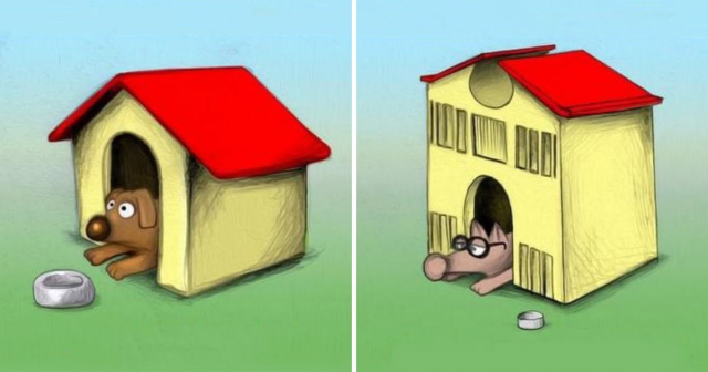 Марко Марилунго, итальянский художник, легко объясняет сложные архитектурные концепции через простой пример: собака, её миска и, конечно же, собачья будка. Это несложное сооружение служит ярким примером для объяснения архитектурных приемов, которые использовали знаменитые мастера.