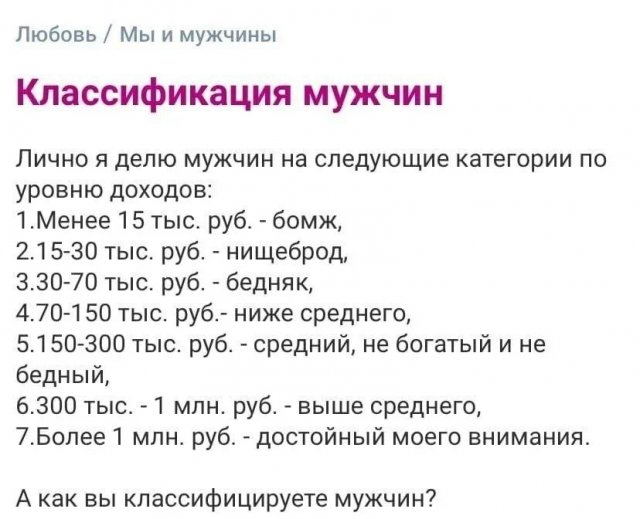 Работаешь, стараешься, даришь подарки — а этого всё равно «недостаточно». На одном популярном форуме девушка выложила собственную классификацию мужчин по уровню заработка. Фото автора, разумеется, не прилагалось. Интересно, на какой ступени вы?