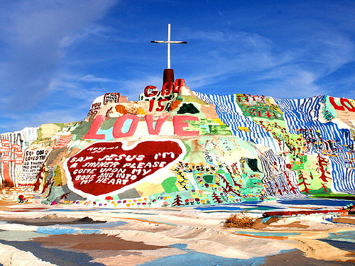 74-летний Леонард Найт последние два десятка лет строит и раскрашивает гору в калифорнийской пустыне. Создавать Гору Спасения (Salvation Mountain), сплошь покрытую цитатами из Библии и религиозными воззваниями, Найт начал в 1985 году и занимается этим по сей день. Его необычайно яркое творение признано одним из самых выдающихся произведений искусства под открытым небом.