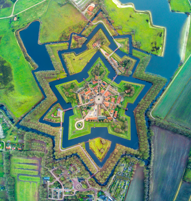 В Нидерландах есть форт, который выглядит как идеальная звезда. Бауртанге построили ещё в 1593 году по приказу Вильгельма Оранского — в разгар войны за независимость от Испании. Крепость перекрывала единственный путь к Гронингену и превращала передвижение врагов в настоящий квест.