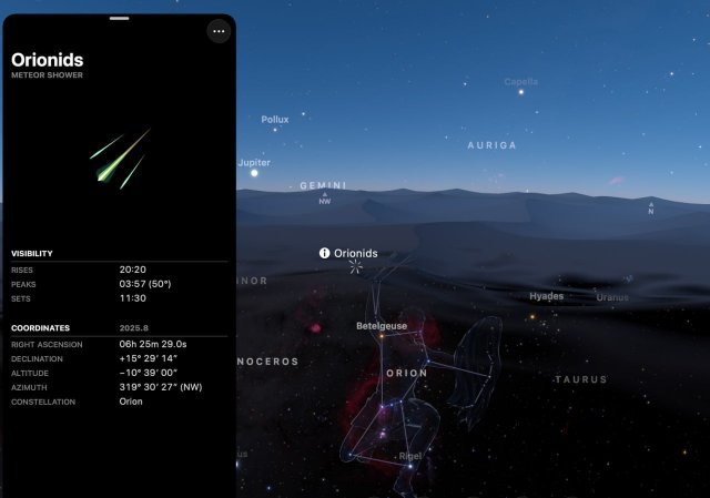 Сегодня ночью начинается пик метеорного потока Ориониды — небо засияет до 25 падающих звёзд в час 💫