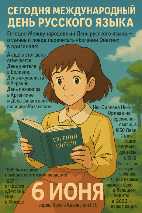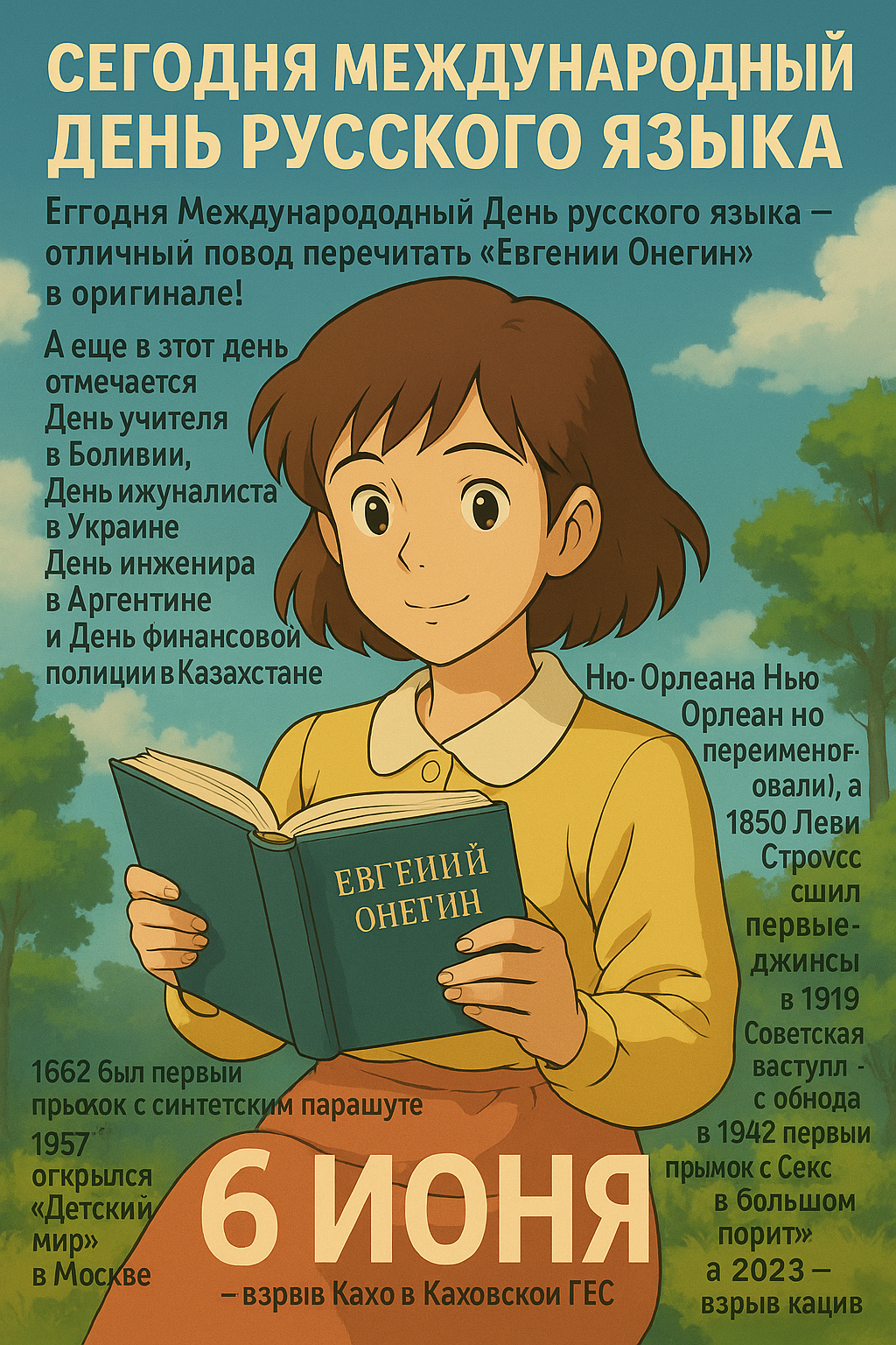 Сегодня Международный день русского языка – отличный повод перечитать "Евгений Онегин" в оригинале! А еще в этот день отмечаются День учителя в Боливии, День журналиста в Украине, День инженера в Аргентине и День финансовой полиции в Казахстане. В 1664 году Новый Амстердам стал Нью-Йорком (но почему-то Нью-Орлеан не переименовали), в 1850 Леви Страусс сшил первые джинсы, в 1919 Советская власть признала Нестора Махно бандитом, в 1942 был первый прыжок с синтетическим парашютом, в 1957 открылся "Детский мир" в Москве, в 1998 стартовал "Секс в большом городе", а в 2023 — взрыв Каховской ГЭС и наводнение.