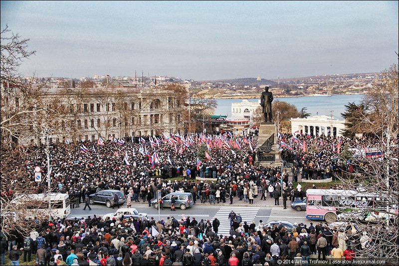 11. Зачитывались обращения с призывами к Путину помочь миротворческим контингентом, снять украинский флаг с мэрии, направлять отряды самообороны на помощь другим городам и даже в поход на Киев, чтобы отбить его у бандеровцев. Не трудно себе представить эйфорию людей, которые даже не представляли как их много и что просто собравшись на площади, они простым поднятием рук убирают постылую власть и говорят "Нет фашизму!". Было много оторванных от реальности слов, но главные слова прозвучали - Севастополь не пойдет на поклон новой власти и будет насколько это возможно ей сопротивляться. На фоне жалкого овоща Януковича и трусливых регионалов, многое из сказанного было свежо, актуально и правильно.