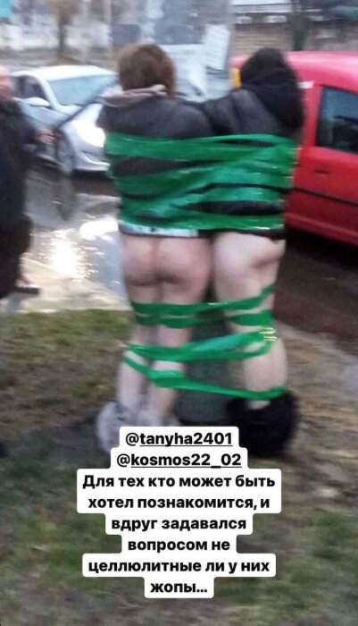 Получили немного, после чего с дамочек спустили штаны и привязали к столбу. Интересно, что засветили их аккаунты в Инстаграме. Потому что мало позорного столба в реальности, таких надо и в социальных сетях прославлять.