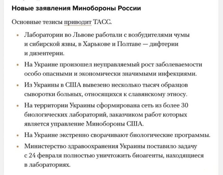 Гуглите: "Минобороны РФ: биолаборатории в Харькове, Полтаве и Львове работали с чумой и дизентерией".
