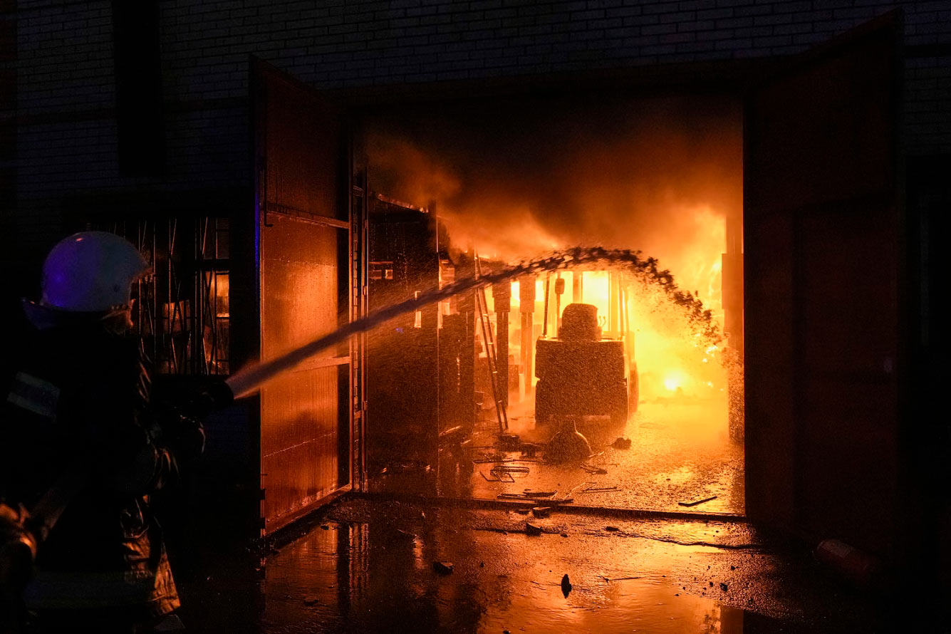 Пожарные за работой в Киеве, 17 марта 2022. Тушение состоит из двух частей — локализации пожара, то есть прекращения распространения огня и дотушивания, то есть ликвидация очага пожара. (Фото Vadim Ghirda):