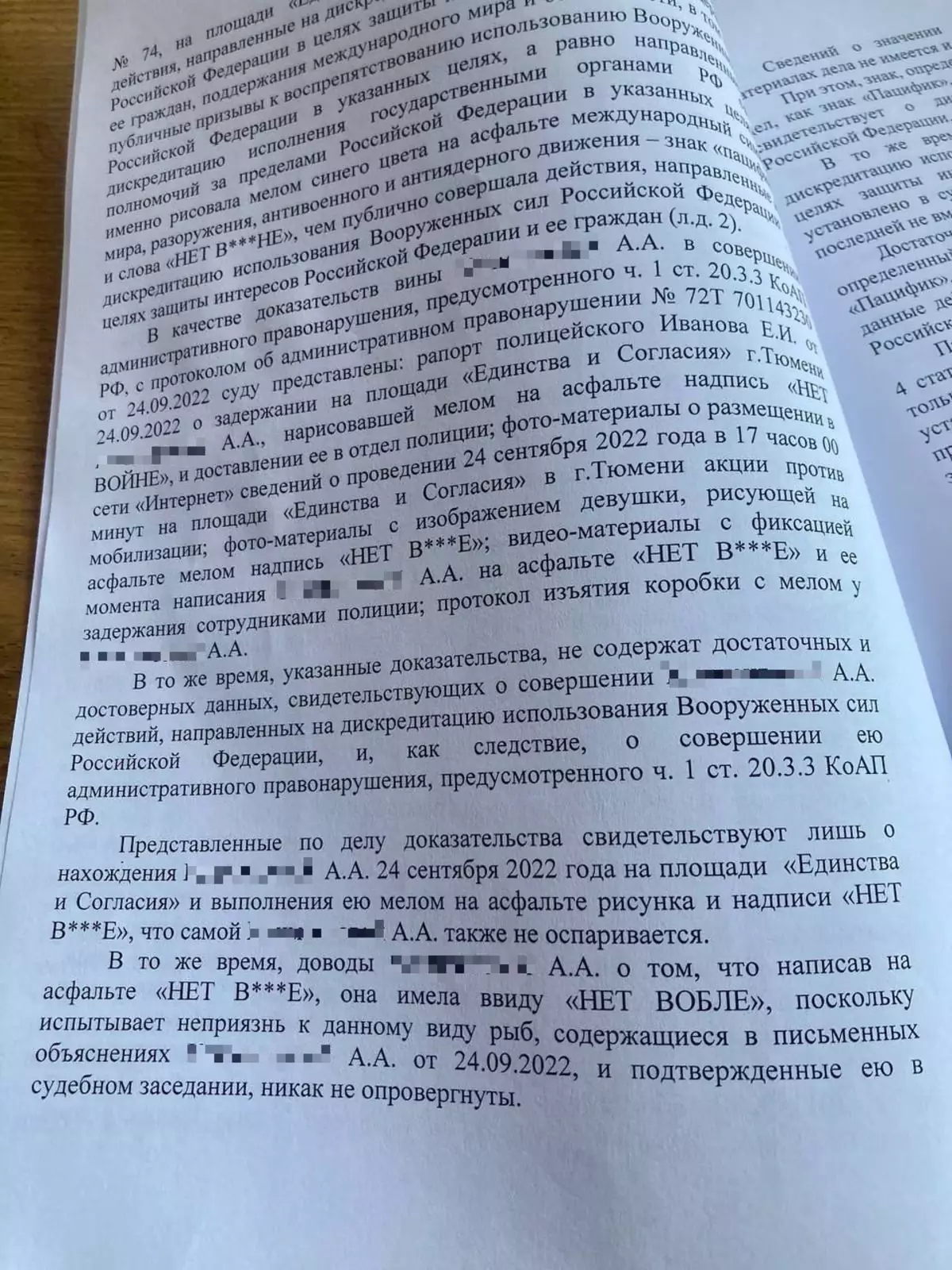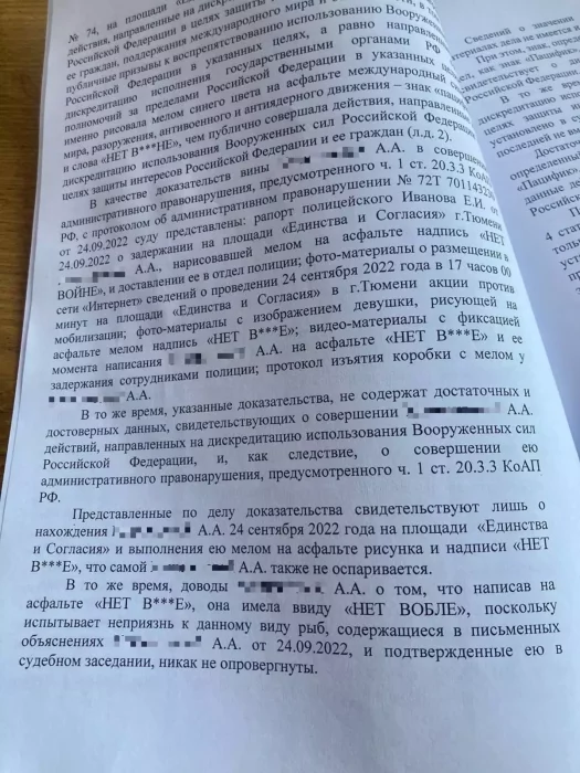 После того, как история разлетелась по сайтам и СМИ, полиция Тюмени надулась, обиделась, да и обжаловало решение о прекращении административного дела по статье о "дискредитации" армии РФ против Алисы Климентовой. Вспомнили вдруг про пацифистский знак, который был нарисован рядом с надписью ☮︎ Потому что он к рыбе отношение не имеет, а имеет отношение к разоружению. То есть явное несогласие с объявленной мобилизацией.