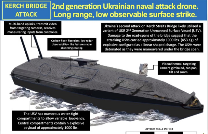 🔘 Ниже украинский морской дрон второго поколения, который есть на рисунке и судя по надписи на рисунке может нести 450 кг взрывчатки. Никаких пруфов нет.