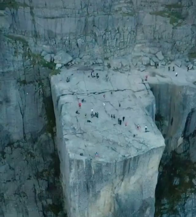 Это Прекестулен — одна из самых известных природных локаций Норвегия. Скала возвышается на 604 метра над уровнем моря и выглядит так, будто её аккуратно срезали ножом.