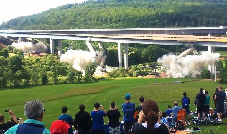 Вот взрыв старого путепровода в Германии между Фульдой и Вюрцбургом, а увидеть его пришло больше 8 тысяч зрителей. Это опять уничтожение старого моста, который оставался целым, пока рядом не возвели новый.