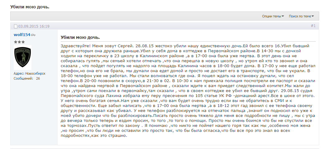 В Новосибирске разгорается скандал вокруг убийства 16-летней школьницы Карины Залесовой. Одним из подозреваемых стал её сверстник Матвей (имя изменено), сын влиятельного бизнесмена, оставленный под домашним арестом. Пользователи соцсетей возмущены историей и опасаются, что виновные так и не будут наказаны.