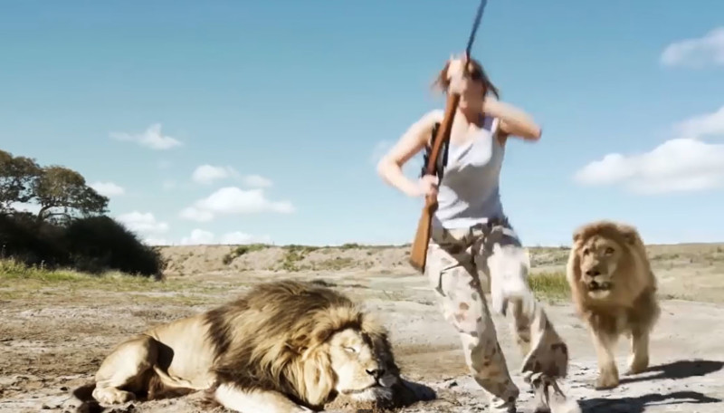 Двое охотников, мужчина и женщина, настроили видеокамеру для того, чтобы сфотографироваться рядом с телом убитого ими льва. Однако именно в этот момент на горизонте появился еще один лев и напал на браконьеров.