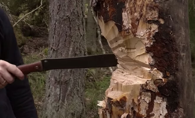 И третий инструмент, который заменит мачете — тесло. Не нужен даже нож: несмотря на длину лезвия, мачете прекрасно справляется с вытесыванием ровных досок из бревен.