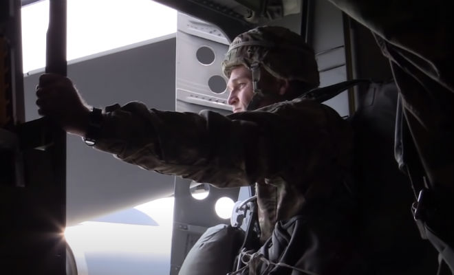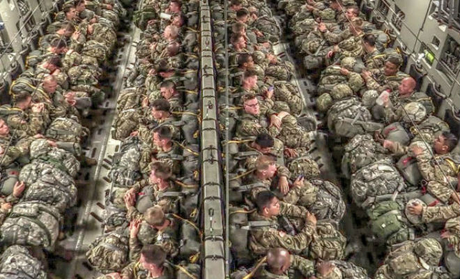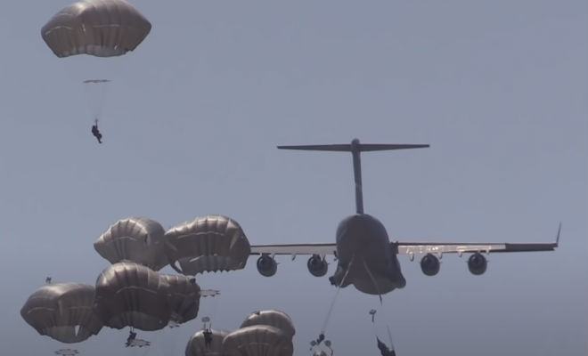Стратегический транспортный самолет Boeing C-17 Globemaster III взял на борт 102 тяжеловооруженных морпеха. Процесс десантирования снимали на видео: все бойцы оказались в воздухе всего за полторы минуты.