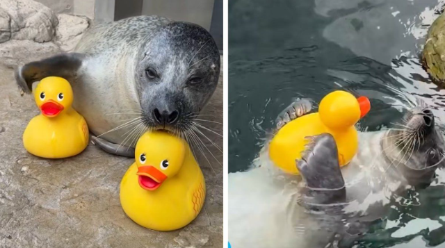 В бостонском аквариуме живёт 33-летний тюлень по имени Регги, который обожает резиновых уточек — он ищет их и даже «обнимает» в воде. Как объясняют сотрудники, это часть программы развития: игрушки прячут в бассейне, а тюлень по команде находит их и приносит.