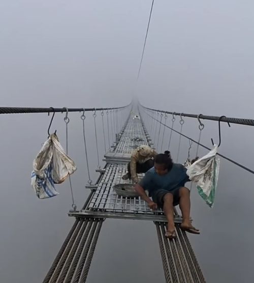 Рабочие строят подвесной мост в Непале на экстремальной высоте в густом тумане