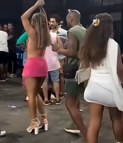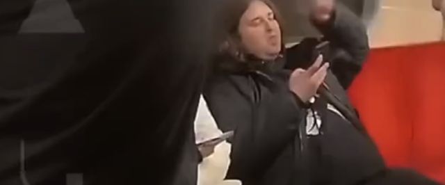 Персонаж в приподнятом настроении растопырил ноги и испачкал джинсы мужику в белой куртке. И понеслось...