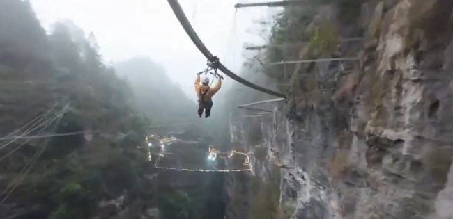 В китайской провинции Гуйчжоу есть экстремальный аттракцион с зиплайном над огромным карстовым провалом — так называемой «небесной воронкой».