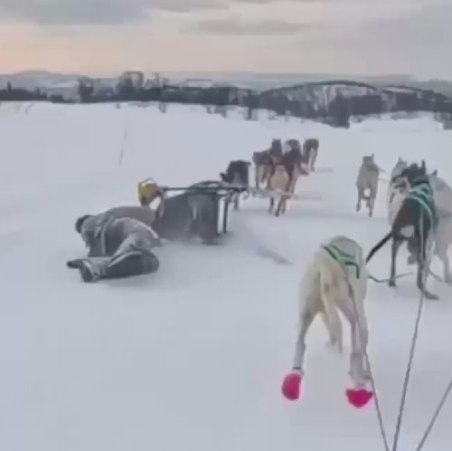 Мадам потеряла контроль над собачьей упряжкой. Однако её подруга, возможно соперница, пришла на помощь. Важно помнить, что если кто-то выпал из нарты, собаки не будут ждать — у них есть строгое расписание.
