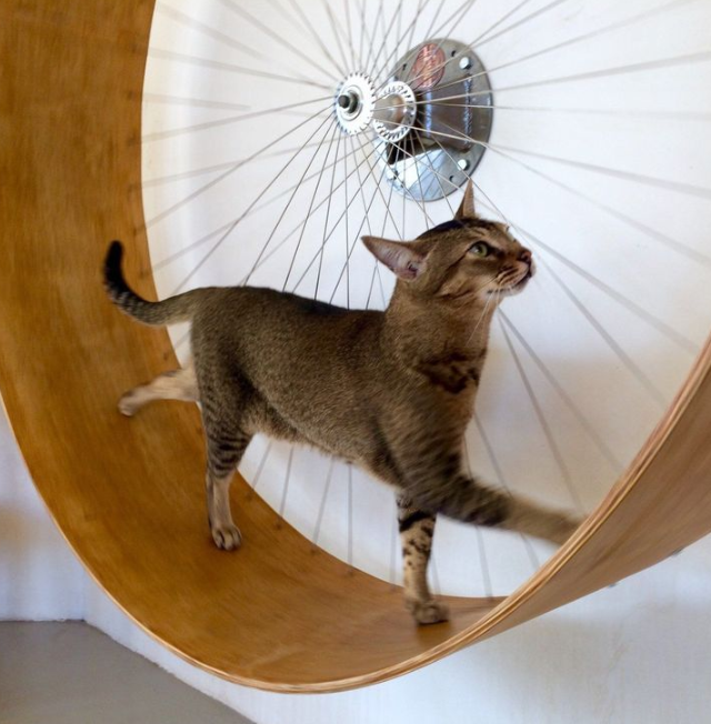 До этого тренажёр занимала другая кошка, но стоило ей освободить место, как пушистый атлет тут же рванул на «дорожку» и устроил настоящую тренировку.