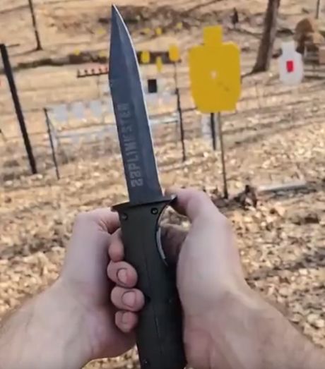 В рукоятке клинка спрятан барабан на 6 патронов.